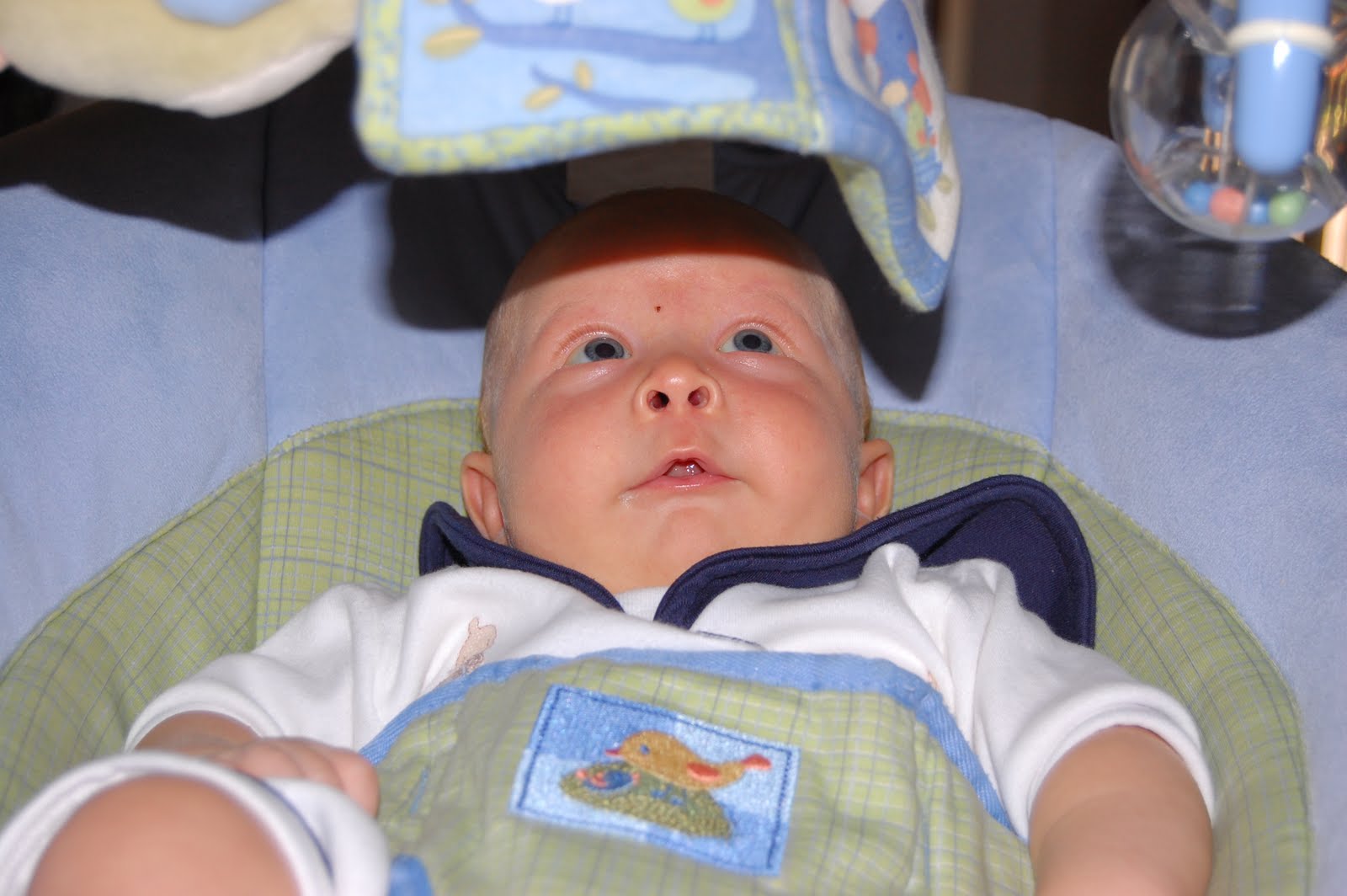 Now onto my little man :)!!! Sorry buddy but week 8 is a bit of a blur and few pictures were taken but I did manage to sneak a few in there!! Your hair is looking a bit red? hmmm…maybe more like Mommy’s?? Eyes are still blue…and eating like a champ!! In your spare time you like to read books (see below), ham it up for the camera, and giggle!! Yes, you giggle!!